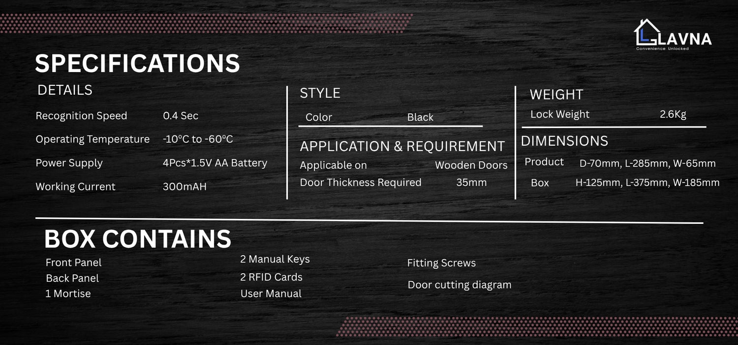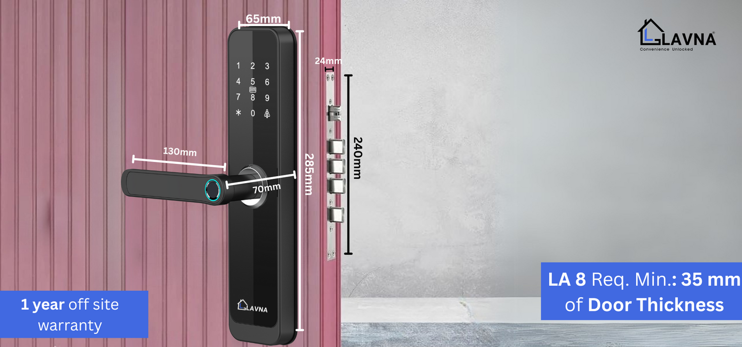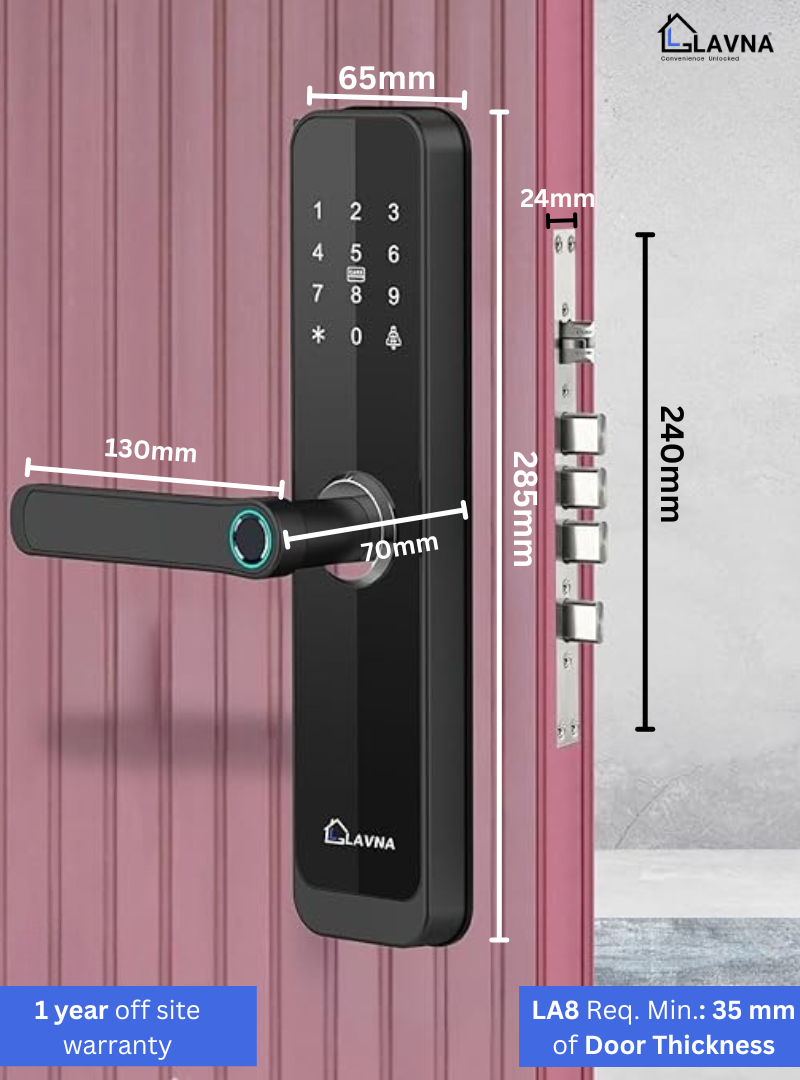 Are you tired of carrying keys everywhere or worrying about unauthorized access to your home? It's time to upgrade to a smarter, more secure solution. Introducing the LAVNA LA8 Smart Door Lock – a modern, feature-rich smart lock designed specifically for wooden doors with a minimum thickness of 35mm. This lock doesn’t just secure your home—it redefines convenience and control with multiple advanced unlocking methods.
